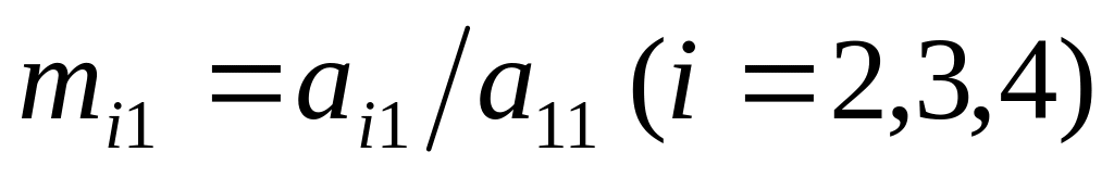 Прямой ход Гаусса. Вычисление L и U вместе с решениям системы Ly=b обычно называется прямым ходом метода Гаусса, имеет (n-1 ) шагов. Основная идея состоит в том, чтобы подучить верхнетреугольную матрицу U и пересчитать вектор b , который является решением системы Ly =b относительно y . Рассмотрим случай n=4 .