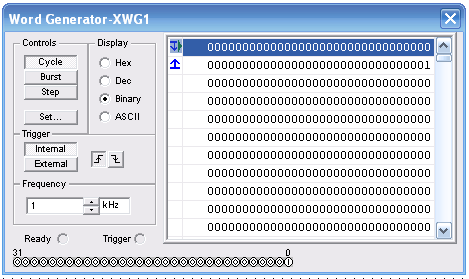 Например, генератор слов Word Generator вырабатывает двоичные слова, то есть сигнал принимает два уровня – нуля и единицы. Для наблюдения результата необходим логический анализатор Logic Analyzer (по сути, это тот же осциллограф, но для цифровых схем).