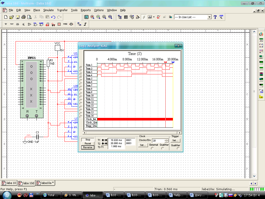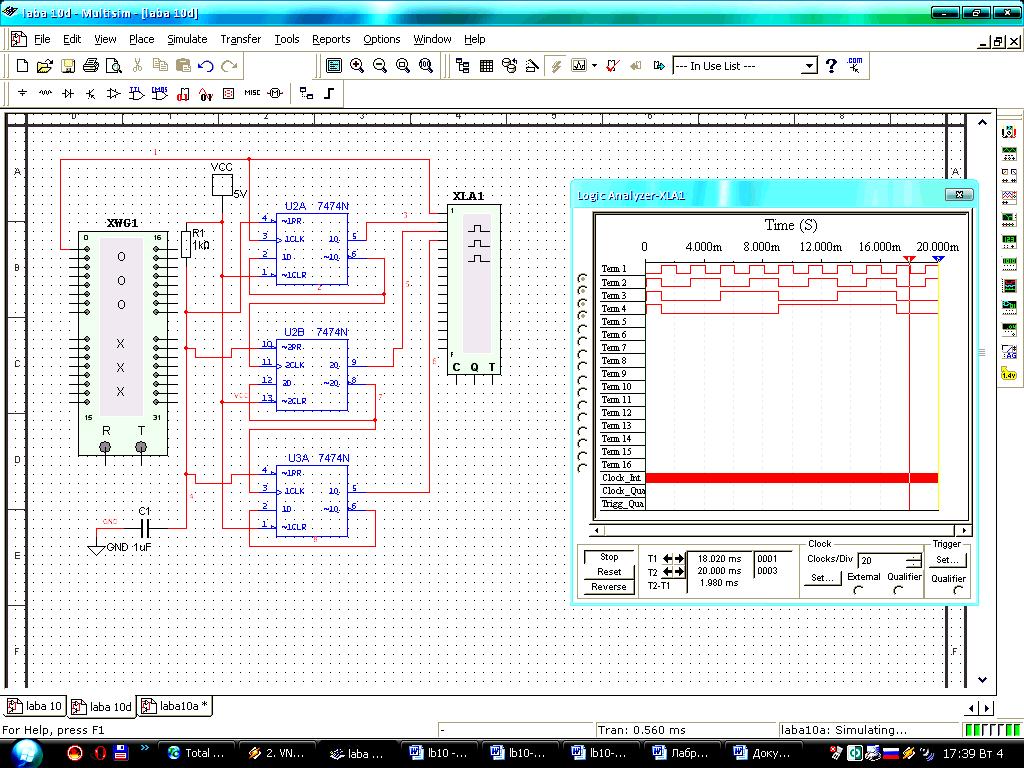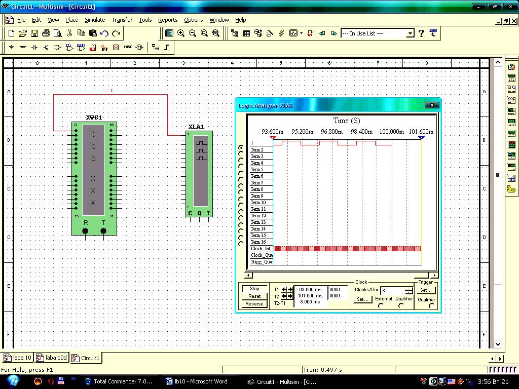 Соединяем выход Word Generator и вход Logic Analyzer в соответствии с рис. 10.2, выполняем настройки последнего в меню Set. Проверяем правильность работы генератора и анализатора в режиме симуляции.