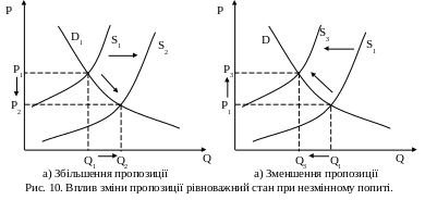 Таким чином, існує зворотній зв’язок між зміною пропозиції і зміною рівноважної ціни, тоді як зв’язок між зміною пропозиції і зміною кількості товарів залишається прямий.