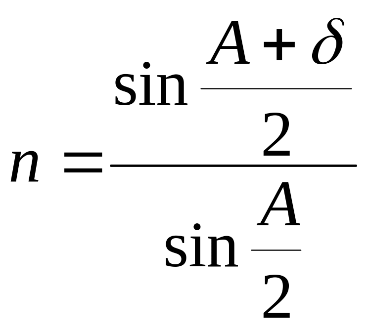 Зависимость между показателем преломления вещества призмы, ее преломляющим углом А и углом отклонения лучей оказывается наиболее простой в том случае, когда угол падения на первую грань равен углу преломления на второй грани. В этом случае угол отклонения имеет наименьшую величину, а показатель преломления может быть рассчитан по следующей формуле: