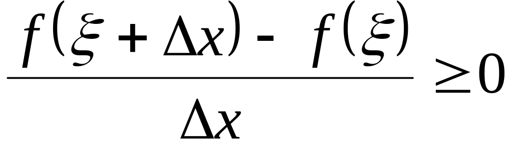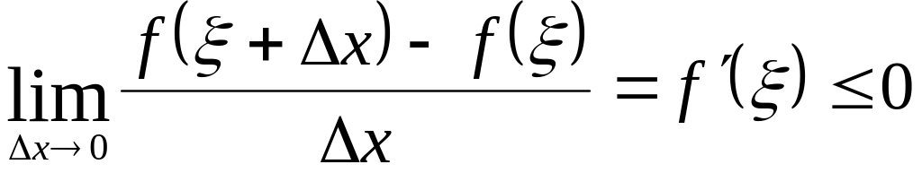 Предположим, что M m. Мы знаем, что оба эти значения функцией достигаются, но, так как f(a) = f(b), то хоть одно из них достигается в некоторой точке ξ между а и b. Для определенности предположим, что f(ξ) = М. Тогда, так как f(ξ) – наибольшее значение функции, то f(ξ + x) – f(ξ) 0 как при Δх 0, так и при x 0.