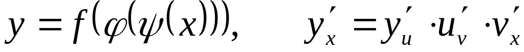 Случай сложной функции, полученной в результате нескольких суперпозиций, исчерпывается последовательным применением правила (3.7). Так, если у = f(u), u = (v), v = (x), то