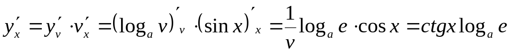 Примеры. 1. Пусть y = loga sin x, иначе говоря, y = loga v, где v = sin x. По правилу (3.7)