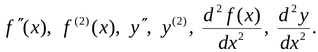 После того как введено понятие второй производной, можно последовательно ввести понятие третьей производной, затем четвертой производной и т.д. Если предположить, что нами уже введено понятие (n – 1)-й производной и что (n – 1)-я производная дифференцируемая в некоторой точке х промежутка Р, т.е. имеет в этой точке производную, то указанную производную называют n-й производной (или производной n-го порядка) функции у = f(x) в точке х и для обозначения ее применяются символы:
