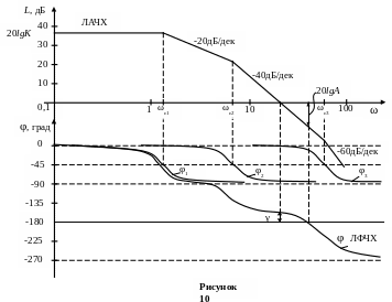 Логарифмические амплитудно-частотную (ЛАЧХ) и фазо-частотную (ЛФЧХ) характеристики будем строить с помощью асимптотических характеристик звеньев. В прямой ветви нашей системы при возмущении со стороны задатчика пять звеньев: два пропорциональных (безынерционных усилительных) звена и три апериодических (инерционных) звена первого порядка. Поэтому ЛАЧХ и ЛФЧХ будут выглядеть подобно показанным на рисунке 10.