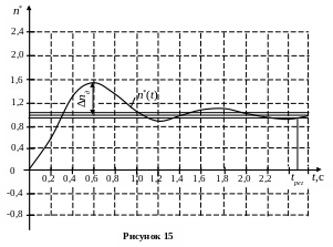 Время регулирования – это время от начала переходного процесса до установившегося режима с определенной погрешностью, например, когда скорость вращения двигателя достигает установившегося значения с точностью 10 %. Динамическую ошибку будем определять как разность между наибольшим значением n(t) и ее установившейся величиной (рисунок 15).