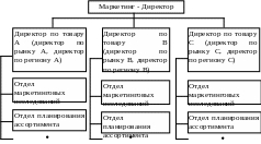 При товарной организации службы маркетинга по каждому товару (товарной группе) назначается управляющий маркетингом (директор) по товару А1(В, С) (рис. 28), которому подчиняются все функциональные отделы (группы). Аналогично формируются рыночная (назначаются управляющие по рынкам) и региональная (назначаются управляющие по территориям) структуры службы маркетинга. Достоинствами данных структур являются учет особенностей товара (рынка, региона), обеспечение полного маркетинга по товару (рынку, региону), а недостатками являются возможное дублирование функций, нарушение единого методического подхода.
