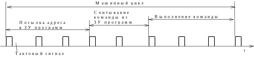 Функционирование всех узлов и блоков микропроцессорной системы (см. рисунок 3.22) инициируется генератором тактовых импульсов. Для выполнения микропроцессором одной команды, хранящейся в ЗУП, требуется несколько периодов тактовых импульсов. Время выполнения команды называется командным циклом. Командный цикл может составлять один или несколько машинных циклов. В машинный цикл входят цикл выборки и исполнительный цикл (рисунок 3.24). Во время цикла выборки микропроцессор определяет адрес команды, находящейся в ЗУП, и считывает эту команду в микропроцессор. За время исполнительного цикла микропроцессор осуществляет выполнение считанной команды.