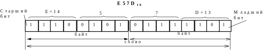 Биты, образующие слово, подразделяют на группы. Группа, состоящая из 8 бит, называется байтом (рисунок 3.23). Деление слова на байты позволяет упростить представление двоичного слова, применив шестнадцатеричную форму записи (шестнадцатеричный код). Так, двоичное число, представленное на рисунке 3.23, будет иметь в шестнадцатеричном коде запись в виде E57D16.
