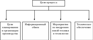 Цели процесса определяют основные ориентиры деятельности внутри организации по переработке поступивших ресурсов. К целям процесса относятся: планирование производственных процессов и их организация, информационный обмен, внедрение новых технологий, техническое обеспечение и др. (см. рис. 4.5).