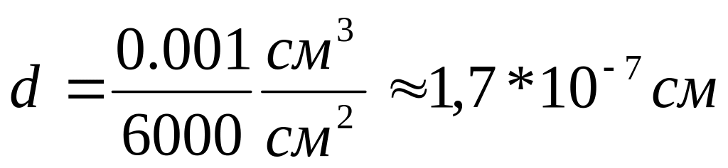 Розглянемо порівняно простий метод оцінки розмірів молекул. Відомо, що не можна змусити краплю маслинового масла об'ємом 1 м3 розпливтися на поверхні води так, щоб вона вкрила площу, більшу 0,6 м2. Можна припустити, що, розпливаючись по максимальній площі, масло утворює шар товщиною лише з молекулу. Об'єм V шару масла рівняється добутку його площі S на товщину d: V=Sd Отже, товщина шару й тим самим розмір молекули маслинового масла рівняються: