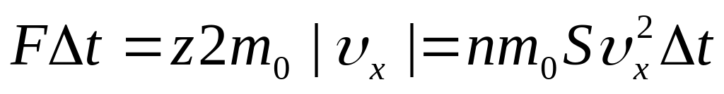 Імпульс середньої сили, що діє на поршень із боку всіх молекул. Кожна молекула під час зіткнення змінює імпульс поршня на 2m0 |υX|. За час ∆t всі z молекул змінять його імпульс на 2m0 |υX|z. Відповідно до другого закону Ньютона модуль F∆t імпульсу сили, що діє на поршень, рівняється модулю зміни його імпульсу: