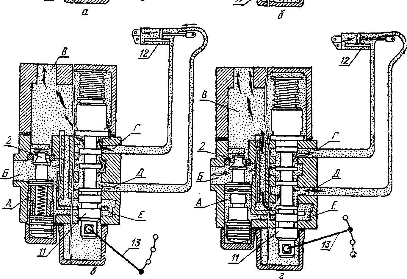 Когда орудие находится в транспортном положе- нии (рис. 285,а), золотник 11 устанавливается в положение «нейтраль- ное». Жидкость от насоса под рабочим давлением поступает в нагнета- тельную полость Б распределителя и по калиброванному отверстию а перепускного клапана 2 идет в отводной канал Е и далее в полость В слива и в бак. Из-за падения давления в полости А над перепускным клапаном 2 клапан открывается давлением жидкости, и она движется параллельным потоком в полость В слива и в бак. Выход жидкости из обеих полостей силового цилиндра 12 будет закрыт, орудие жестко за- фиксируется относительно остова трактора.