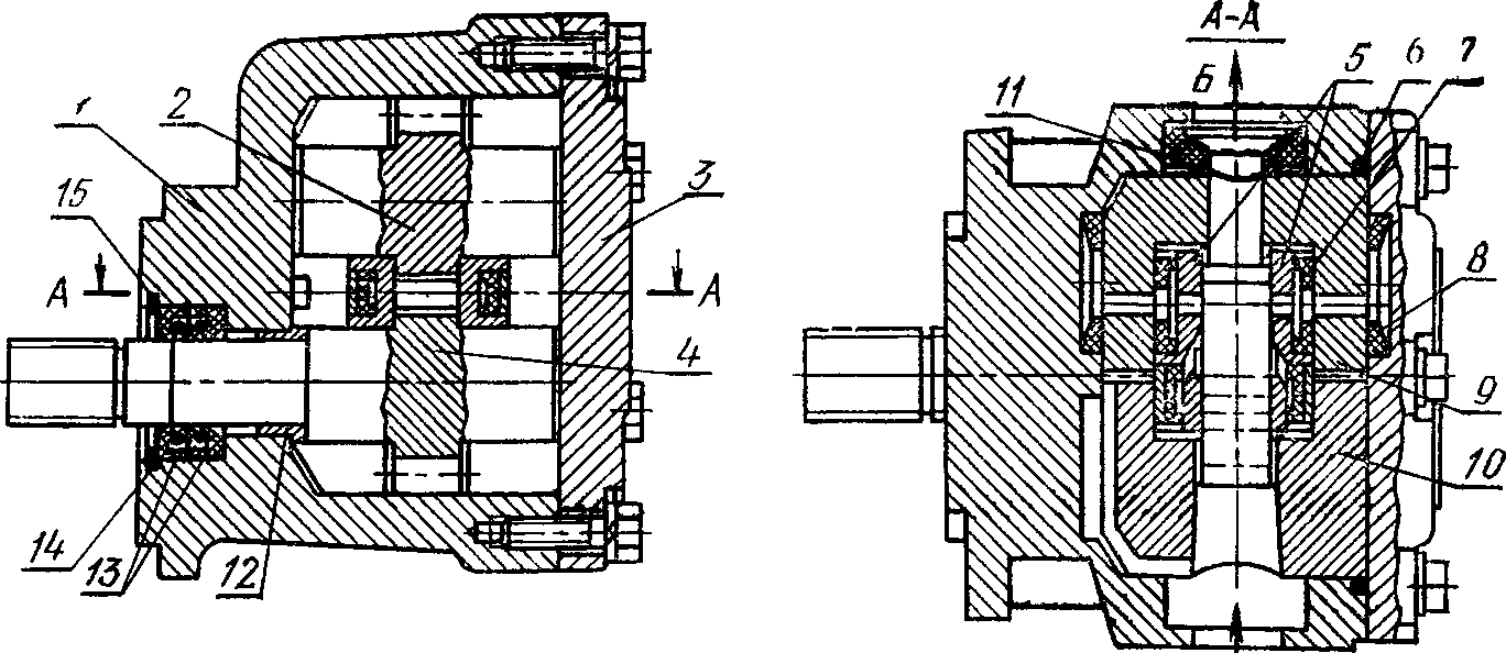 Уплотнение по торцам зубьев выполняется двумя платнками 5, помещенными в поджимной 9 и подшипниковой 10 обоймах. В месте размещения манжет 7 давление жидкости поджимает платики к торцам шестерен. Манжеты 8. находящиеся в расточках корпуса и крышки, образуют область противодавления, разгружающую поджимную обой- му 9 от давлений на нее со стороны манжет 7.