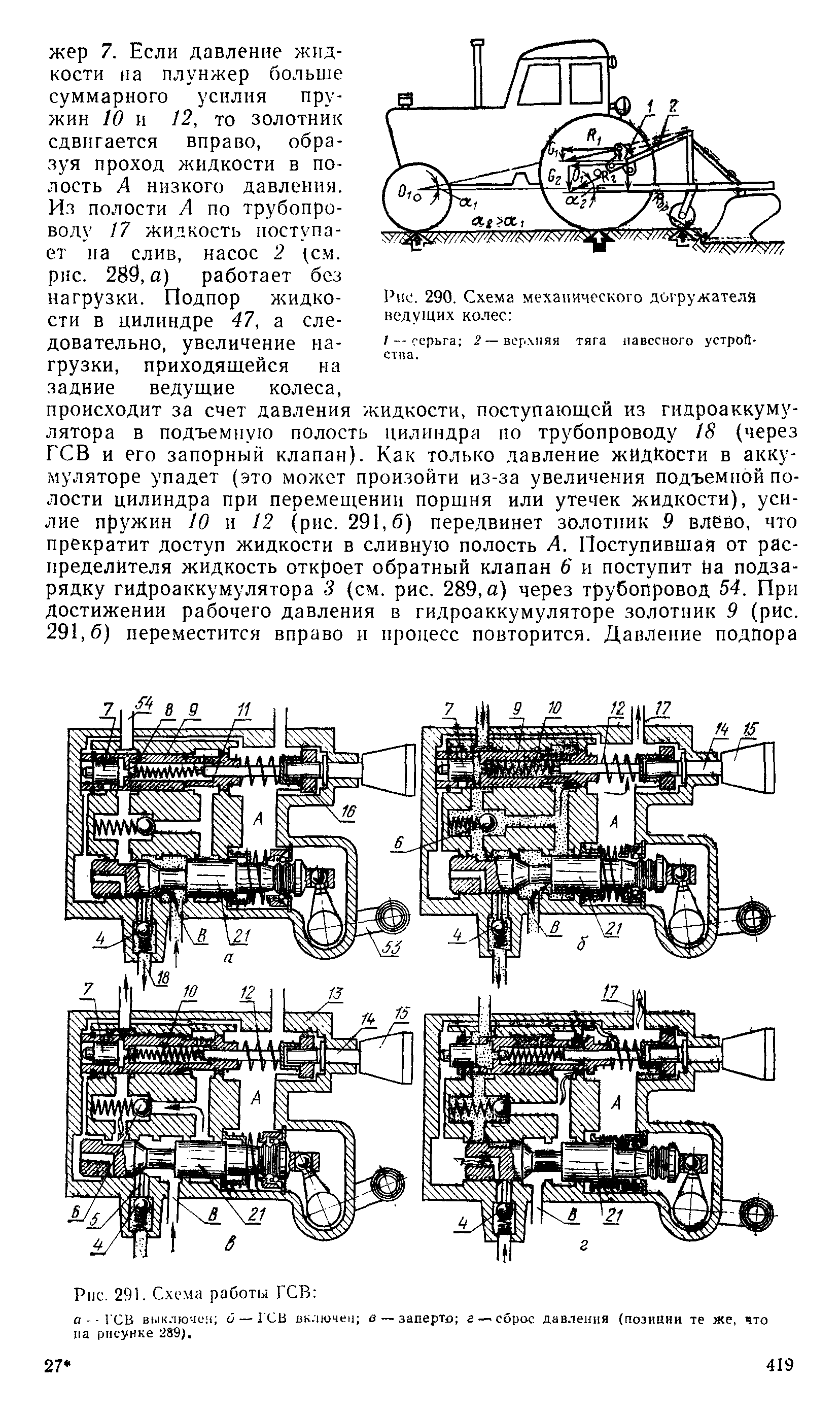 Подъемная полость цилиндра 47 (рис. 289, ал трубопроводом 18 соединена с полостью запорного клапана 4 (рис. 291); полость высоко- го давления золотника распределителя (рис. 289, а) — с полостью вы- сокого давления ГСВ. Сливная полость ГСВ сообщается с трубопрово- дом 17. К полости обратного клапана подсоединен гидроаккумулятор 3. Его назначение — создавать постоянный подпор жидкости в цилинд- ре 47, когда ГСВ включен. Он состоит из кожуха, штока, поршня, ци- линдра и пружины. Шток с поршнем неподвижно закреплен в кожуКС; цилиндр, поджимаемый пружиной, скользит по поршню. При поступле- нии жидкости в цилиндр через отверстие ШТОка в его надиоршневОм объеме создается давление и цилиндр, сжимая пружину, подзаряжает гидроаккумулятор. Давление Масла в гидроаккумуляторе, когда он сообщается с подъемной полостью цилиндра 47 (через ГСВ и трубо- провод 18), создает подпор, увеличивающий Нагрузку, действующую на задние йедущие колеса трактора. Работает ГСВ при различных по- ложениях рукоятки 53 (рис. 291, а) следующим образом.