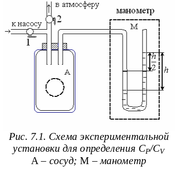 При накачивании воздуха в сосуд А давление в нем повышается, разность уровней в манометре растет. Накачивание воздуха можно провести изотермически (медленно) или адиабатически (быстро). При повторении опытов следует пользоваться одним из этих способов. Если сжатие адиабатическое, то температура воздуха при этом повышается. После прекращения накачивания будет протекать изохорный процесс с понижением температуры. Если открыть кран, то часть воздуха быстро выходит из сосуда – это адиабатное расширение воздуха, следствием которого является понижение температуры в сосуде А. После закрытия крана начинается процесс изохорного нагревания воздуха.