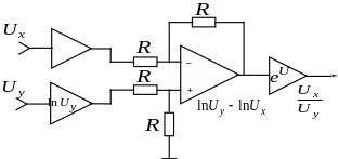 Для отримання добутку сигналів попередньо прологарифмований сигнал підсумовується. Для ділення різниця логарифмів потенціюється.