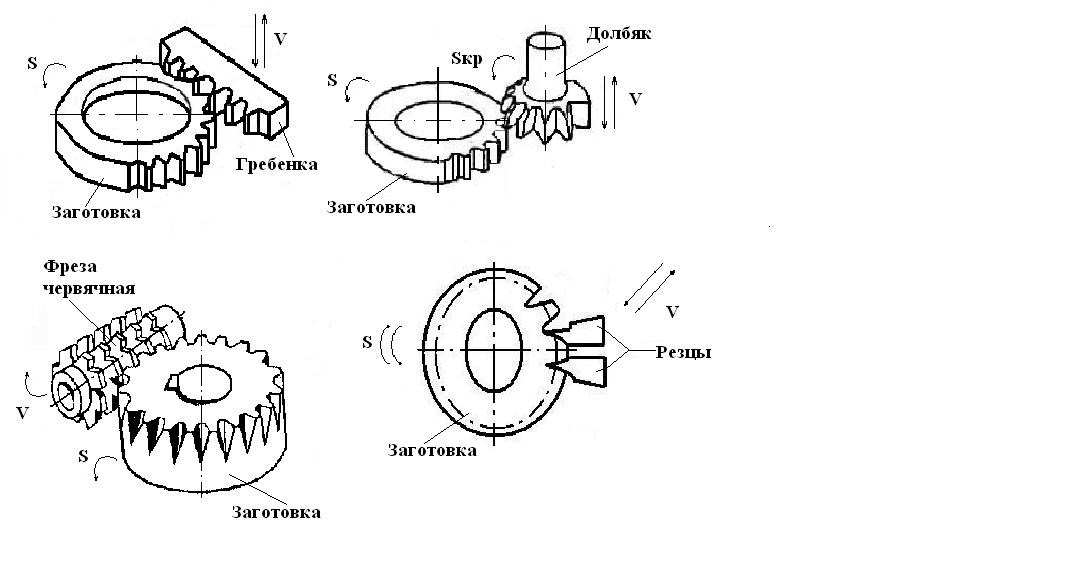 Метод обкатки основан на зацеплении зубчатой пары, элементами которой являются червячная фреза и заготовка нарезаемого колеса (рисунок 4.2.). При фрезеровании зубьев червячной фрезе и заготовке сообщают такое вращение,как если бы червячная фреза и нарезаемое колесо находились в действительном и правильном зацеплении. Различные способы нарезания зубчатых колес методом обкатки (гребенкой, долбяком, червячной фрезой и резцами) представлены на рисунке 4.2.