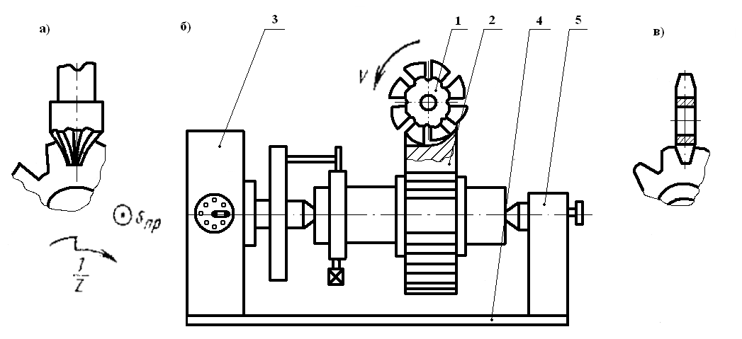 Заготовку 2 устанавливают в центрах делительной головки 3 и задней бабки 5. После фрезерования каждой впадины стол 4 с заготовкой возвращается в исходное положение и заготовка с помощью делительной головки поворачивается на один зуб. Такой способ является малопроизводительным и применяется для нарезания зубчатых колес крупного модуля пальцевой модульной фрезой в единичном производстве.