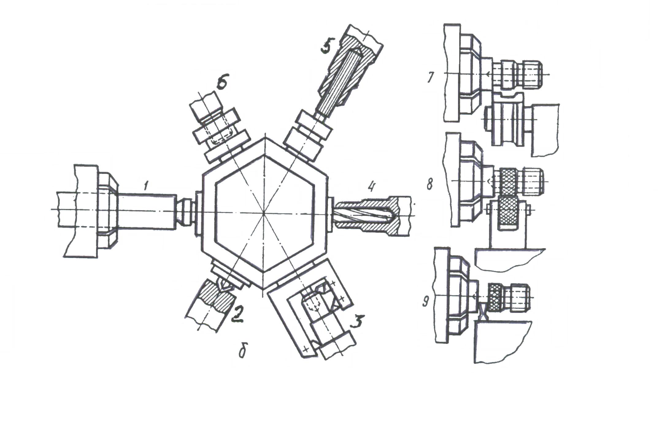 На рисунке 2.4, поз. б приведен пример наладки револьверного станка для изготовления из прутка втулки с накатанной головкой. Последовательность позиций обработки следующая: 1 – подача прутка до упора; 2 – подрезка торца резцом, установленным в поперечном суппорте, и зацентровка отверстия; 3 – сверление отверстия на половину глубины и одновременное обтачивание двух цилиндрических поверхностей и фаски; 4 – сверление отверстия на необходимую глубину; 5 – развертывание отверстия; 6 – нарезание наружной резьбы плашкой; 7 – точение фасонным резцом; 8 – накатывание головки; 9 – отрезание готовой детали.