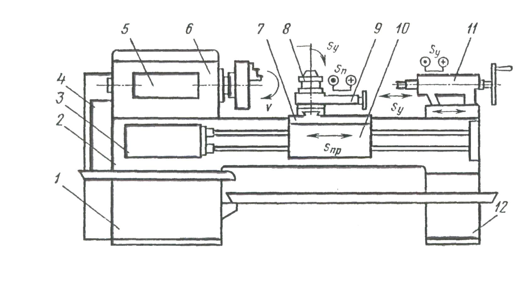 2.1.2 Устройство токарно-винторезного станка. Основные части токарно-винторезного станка (рисунок 2.1): станина 2, передняя бабка 6, задняя бабка 11, коробка подач 3, суппорт 7.
