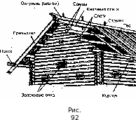 Для более плотного прилегания бревен в каждом венце делали продольный паз, а в верхних или нижних концах бревен делались «чаши» — вырубки для крепления бревен между собой. Избы чаще всего имели самцовую конструкцию кровли (рис. 92), и поныне широко распространенную в России. Суть ее в том, что в самцы — бревенчатые обрубки, замыкающие треугольником чело избы, врубаются длинные бревна — слеги, по которым на оба ската настилают wee (плоские, колотые доски), являющиеся покрытием кровли. Верхние концы теса, лежащие на последней, князевой слеге, обычно заводятся под тяжелое бревно, в нижней части имеющее паз — охлупень, или шелом, конек. Внизу тесины упираются в поток (желоб), который отводит воду от