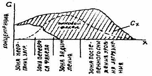 По мере удаления от трубы в направлении распространения промвыбросов выделяется три зоны загрязнения: 1) переброс факела выбросов, характеризующийся относительно невысоким содержанием вредных веществ в приземном слое атмосферы; 2) задымление с максимальным содержанием вредных веществ; 3) постепенное снижение уровня загрязнения (рис.10).