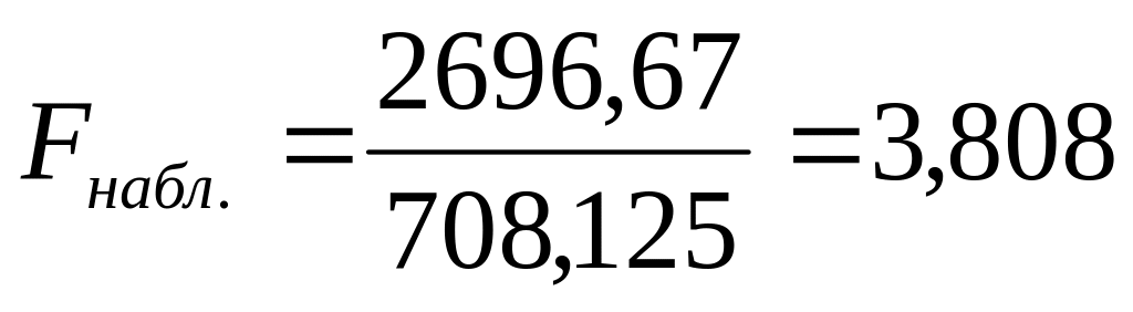 Обчислимо значення, що спостерігається, F-критерію розподілу Фішера-Снедекора як відношення більшого середнього квадрата до меншого: