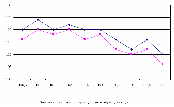 Графік залежності обсягів продажу від темпів підвищення цін наведено на рисунку.