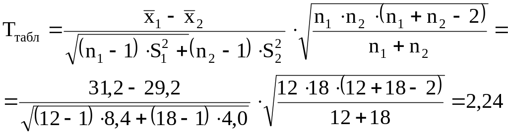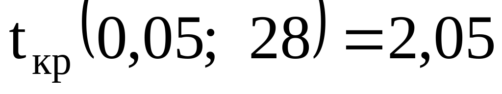 По таблиці граничних значень двостороннього t-розподілу Ст`юдента знаходимо при числі ступенів свободи k1=n1+ n2–2=12+18–2=28 і прийнятому рівні значимості =0,05 (додаток Б):