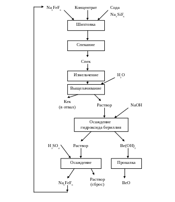 В результате взаимодействия берилла при температурах 750 - 800 °С с комплексными фторидами образуется растворимый в воде фторобериллат натрия Na2BeF4. Соединения других элементов, содержащиеся в продукте спекания, малорастворимы в воде.