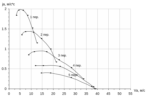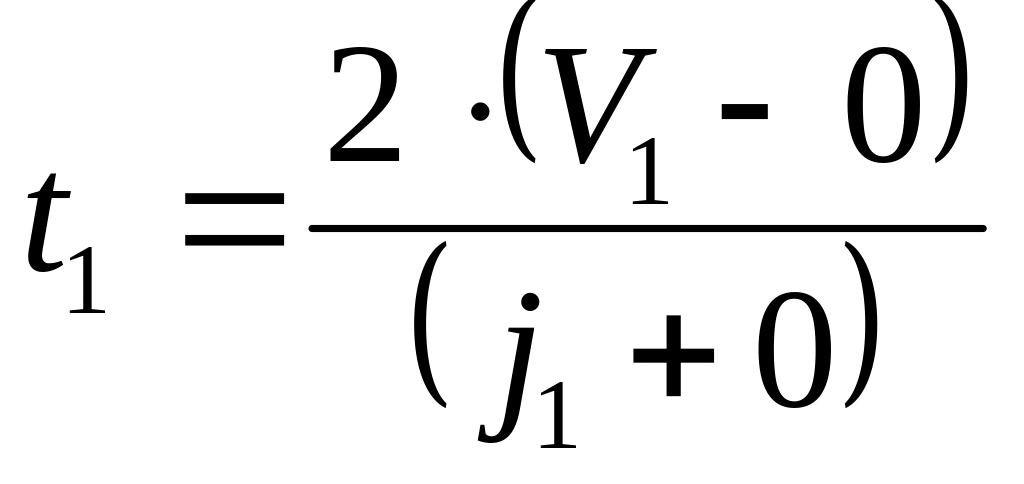 С помощью данного графика, на основе методики предложенной Яковлевым, могут быть получены итоговые показатели тягово-скоростных свойств: графики времени и пути разгона АТС до максимальной скорости. Для этого на графике ускорений автомобиля выделяются участки скорости движения автомобиля, соответствующие его разгону на первой, второй и последующих передачах. Затем каждый из этих участков разбиваются на 4-6 интервалов. Границы интервалов и участков скорости обознаются последовательно V1 ,V2 ,V3 и т.д., соответствующие им значения ускорений обозначаются j1 , j2 , j3 и т.д.