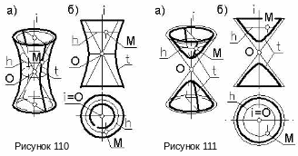 Построение некоторой точки М на каждой из этих поверхностей производится при помощи их параллелей h (см. рисунки 108-111).