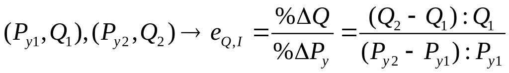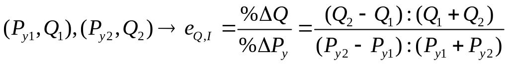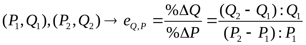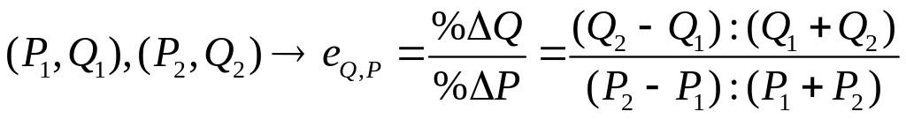 Знаходження дугової еластичності попиту за ціною на основі дискретних значень функції попиту , і відповідних цін , .
