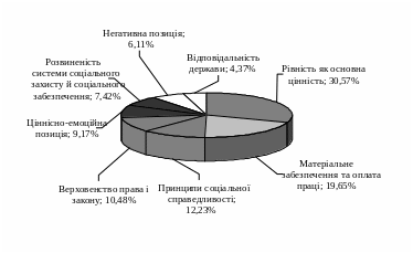 1. Рівність як основна цінність (30,57% всіх висловлювань) відображає рівність умов, що має забезпечити громадянам усебічний соціальний розвиток і необхідне отримання матеріальних і культурних благ. Ця категорія представляє один з основних принципів соціалістичної й соціал-демократичної ідеології (під рівністю в соціал-демократичній ідеології розуміють «вираження однакової цінності всіх людей», вона є «обов'язковою умовою вільного розвитку особистості» [162]). Серед основних висловлювань, які відображають сутність соціальної справедливості, можна відзначити: «рівність», «рівність у суспільстві», «справедливий розподіл всіх життєвих благ», «рівність усіх громадян», «відсутність явної матеріальної відмінності між людьми» тощо. Досить великий показник згаданої категорії пов'язаний із стійким уявленням в сучасному українському суспільстві про провідну роль держави в забезпеченні рівності прав і можливостей, а також із панівною ціннісно-смисловою системою «радянського типу» й комуністичної ідеології. Незважаючи на це «рівність» як цінність та ідеологему можна впроваджувати за допомогою соціально-політичного маркетингу в суспільну думку як «рівність умов та можливостей», що поєднує у своєму смисловому значенні відповідальність держави й відповідальність самої особистості в розвитку та самореалізації.