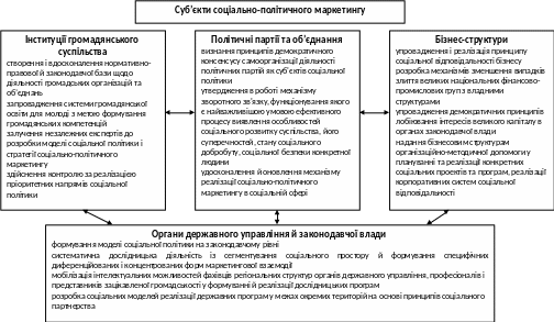 Одним з головних суб’єктів соціально-політичного маркетингу виступають політичні об’єднання громадян. На нашу думку, оптимізації діяльності політичних партій як суб'єктів соціальної політики сприятиме здійснення ними низки основоположних принципів, моментів. Найважливішими серед них є такі: