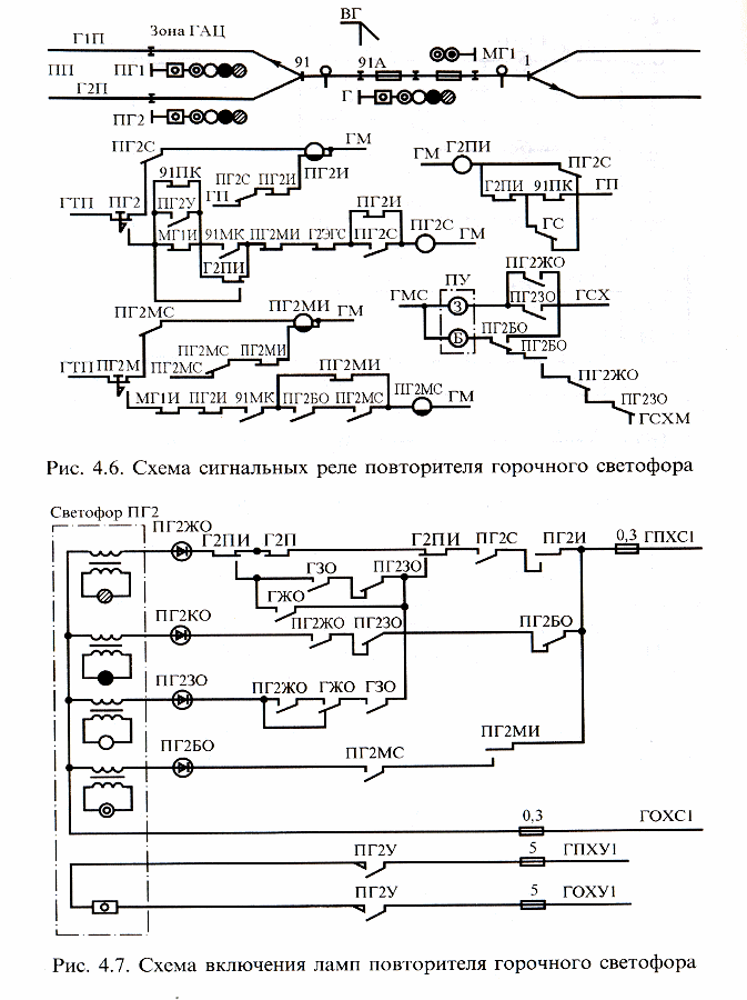 Повторители горочного светофора ПГ1 и ПГ2 (рис. 4.6) работают в режимах повторения показаний светофора Г. Если стрелка 91 установлена в минусовое положение, то светофор ПГ2 после нажатия кнопки ПГ2, включения реле ПГ2С и выключения реле Г2ПИ повторяет показания горочного светофора Г. Это достигается включением в цепи управления огнями светофора ПГ2 (рис. 4.7) контактов огневых реле ГЖО и ГЗОсветофора Г.