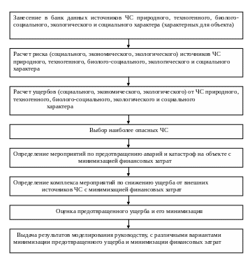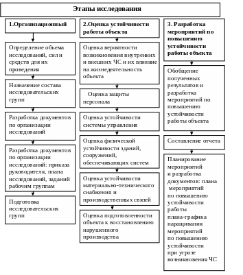 Примерный алгоритм оценки воздействия ЧС на устойчивость работы объекта и определения мероприятий по обеспечению его устойчивой работы приведен на рис. 2. Исследования проводятся по различным методикам, учитывающим специфику объекта.