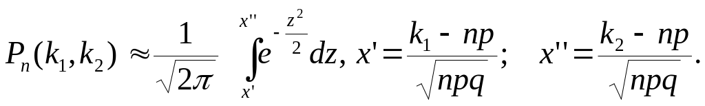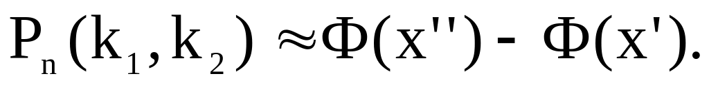 Если вероятность р наступления события А в каждом испытании постоянна и отлична от нуля и единицы, то вероятность Рn(k1, k2)того, что событие А появится в n испытаниях от k1 до k2 раз, приближенно равна: