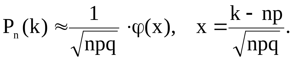 Примечание. Если вероятность р появления события А в каждом испытании постоянна и отлична от нуля и единицы, то вероятность Pn(k) того, что событие А появится в n испытаниях ровно k раз, приближенно равна (тем точнее, чем больше n):