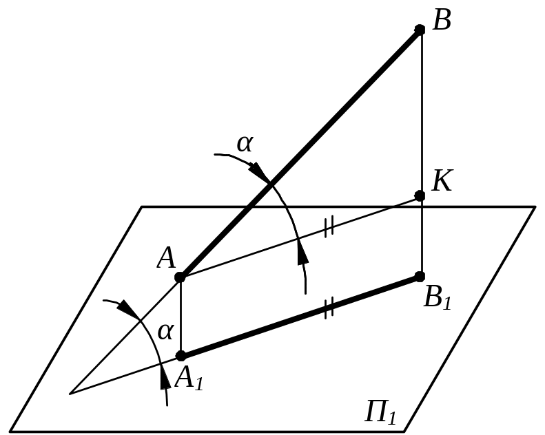 х1 // А1В1; А4В4 – дійсна величина; α – кут нахилу до горизонтальної площини проекцій; |