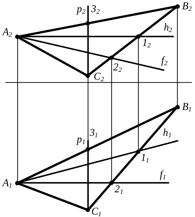 h – горизонталь; f – фронталь; p – профільна. Всі горизонталі однієї і тієї ж площини між собою паралельні. Теж можна сказати про фронтальні і профільні прямі.
