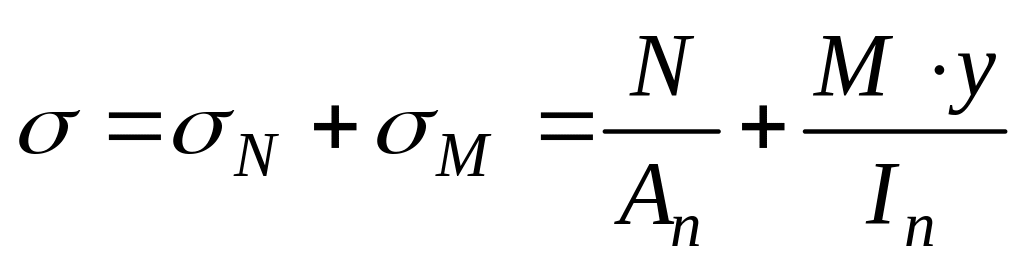 де перший доданок описує епюру напружень, зумовлених нормальною силою, а другий — згинальним моментом.
