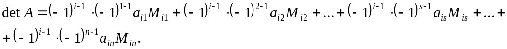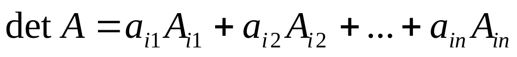 Алгебраїчні доповнення Аsj (j=1,2,...,n) не залежать від елементів аsj, тому остання рівність буде справедливою при будь-яких значеннях елементів аsj , зокрема й при аsj = аij (тобто, коли на місці елементів s-го рядка знаходитимуться елементи і-го рядка). Але при аsj=аij визначник detA матиме два однакові рядки і тому дорівнюватиме нулю. Тому
