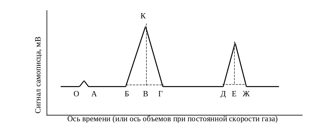В некоторый период времени О проба вводится в колонку. До выхода отдельных компонентов пробы перо самописца вычерчивает прямую линию (ОА, АБ, ГД), называемую основной. В период времени А из колонки выходит газ-носитель. Объем газа, прошедшего через колонку за время ОА, представляет собой объем задержки колонки.