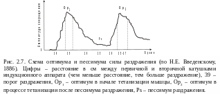 Нарушение закона силы. Русский физиолог Н.Е. Введенский (1896 – 1901 г.г.) в опытах возбуждения скелетной мышцы с нерва открыл два явления противоречащих закону силы – пессимум силы раздражения и парабиоз.