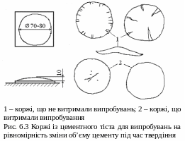 При недостатній тонкості помелу, неправильному збереженні і наявності в різних кількостях домішок СаО, Mg, CaSO4 може спостерігатися нерівномірна зміна об’єму цементу у процесі твердіння цементного тіста.