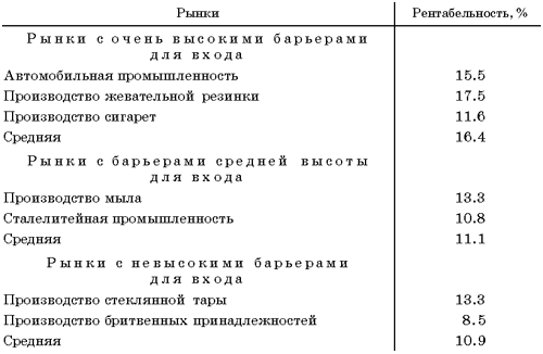по исследованиям американского ученого М. Манна,5 для отраслей с высокими барьерами для входа характерен и более высокий уровень доходности (табл. 8).