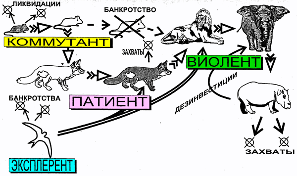 Если патиент укрепляется и занимает все большую часть своего рыночного сегмента, выходя на национальный или даже международный уровень, он либо окончательно закрепляется в своей нише (и заканчивает свой рост), либо переходит в сферу массового производства. Таким образом, он превращается в виолента – «гордого льва», удовлетворяющего своей продукцией быстро растущий спрос на какую-либо массовую разновидность товаров или услуг.